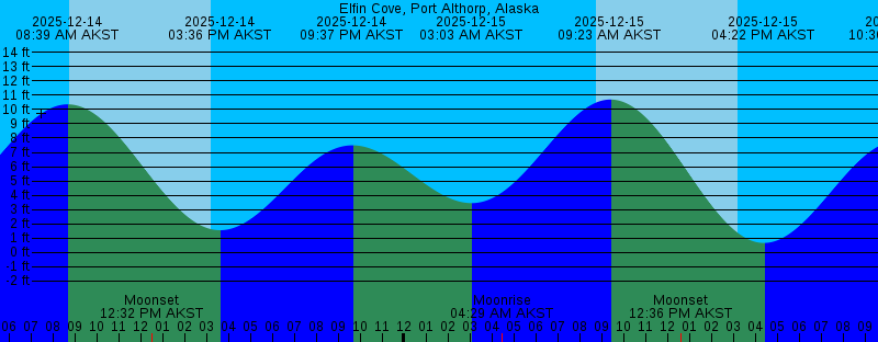 2025-12-14 08:39 AM AKST 10.36 feet High Tide 2025-12-14 08:46 AM AKST Sunrise 2025-12-14 12:32 PM AKST Moonset 2025-12-14 03:14 PM AKST Sunset 2025-12-14 03:36 PM AKST 1.55 feet Low Tide 2025-12-14 09:37 PM AKST 7.49 feet High Tide 2025-12-15 03:03 AM AKST 3.45 feet Low Tide 2025-12-15 04:29 AM AKST Moonrise 2025-12-15 08:47 AM AKST Sunrise 2025-12-15 09:23 AM AKST 10.70 feet High Tide 2025-12-15 12:36 PM AKST Moonset 2025-12-15 03:14 PM AKST Sunset 2025-12-15 04:22 PM AKST 0.66 feet Low Tide 2025-12-15 10:36 PM AKST 7.85 feet High Tide 2025-12-16 03:53 AM AKST 3.71 feet Low Tide 2025-12-16 05:54 AM AKST Moonrise 2025-12-16 08:48 AM AKST Sunrise 2025-12-16 10:04 AM AKST 11.00 feet High Tide 2025-12-16 12:42 PM AKST Moonset 2025-12-16 03:14 PM AKST Sunset 2025-12-16 05:03 PM AKST -0.08 feet Low Tide 2025-12-16 11:25 PM AKST 8.23 feet High Tide 2025-12-17 04:37 AM AKST 3.87 feet Low Tide 2025-12-17 07:19 AM AKST Moonrise 2025-12-17 08:49 AM AKST Sunrise 2025-12-17 10:42 AM AKST 11.23 feet High Tide 2025-12-17 12:54 PM AKST Moonset 2025-12-17 03:14 PM AKST Sunset 2025-12-17 05:41 PM AKST -0.64 feet Low Tide 2025-12-18 12:08 AM AKST 8.55 feet High Tide 2025-12-18 05:18 AM AKST 3.97 feet Low Tide |